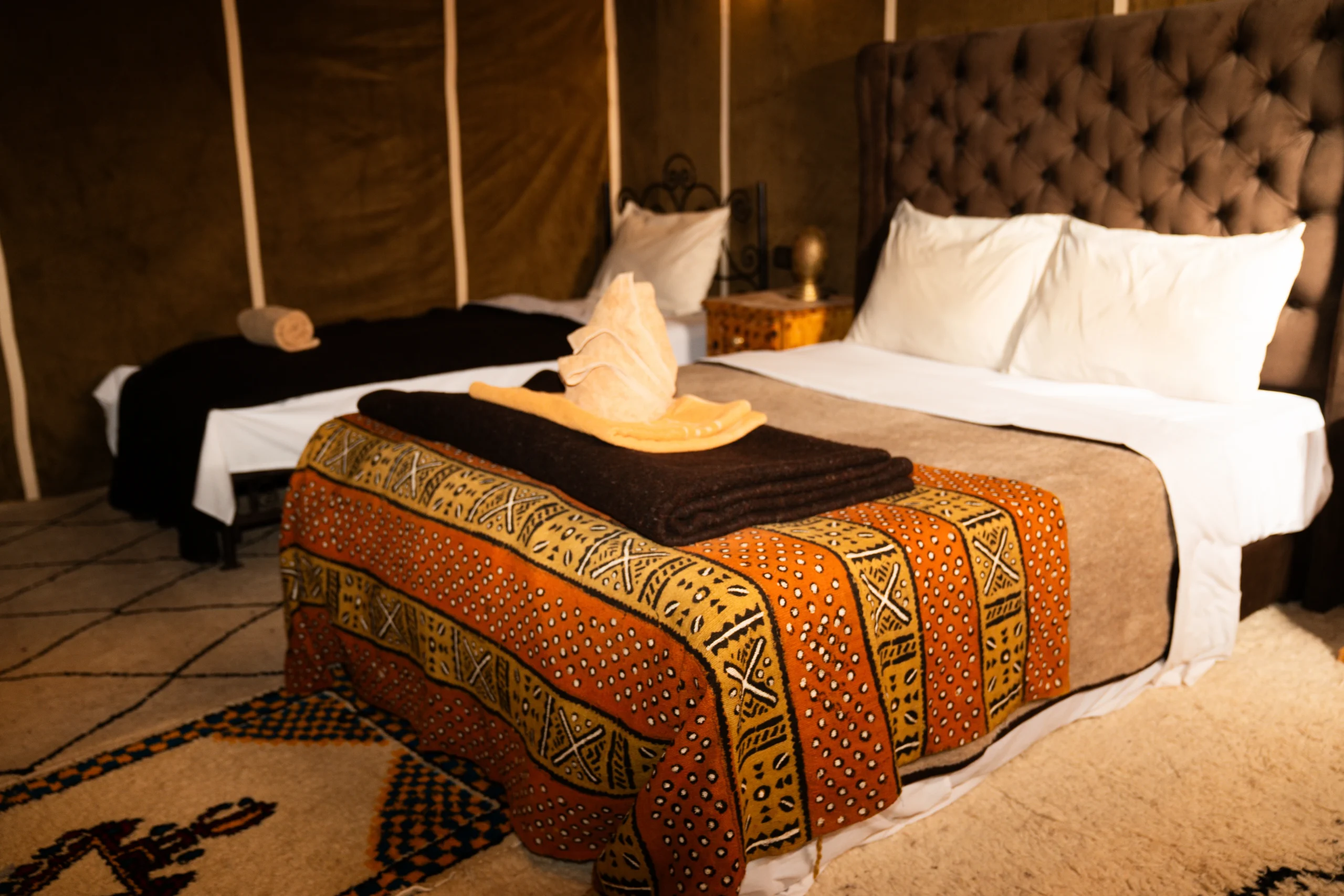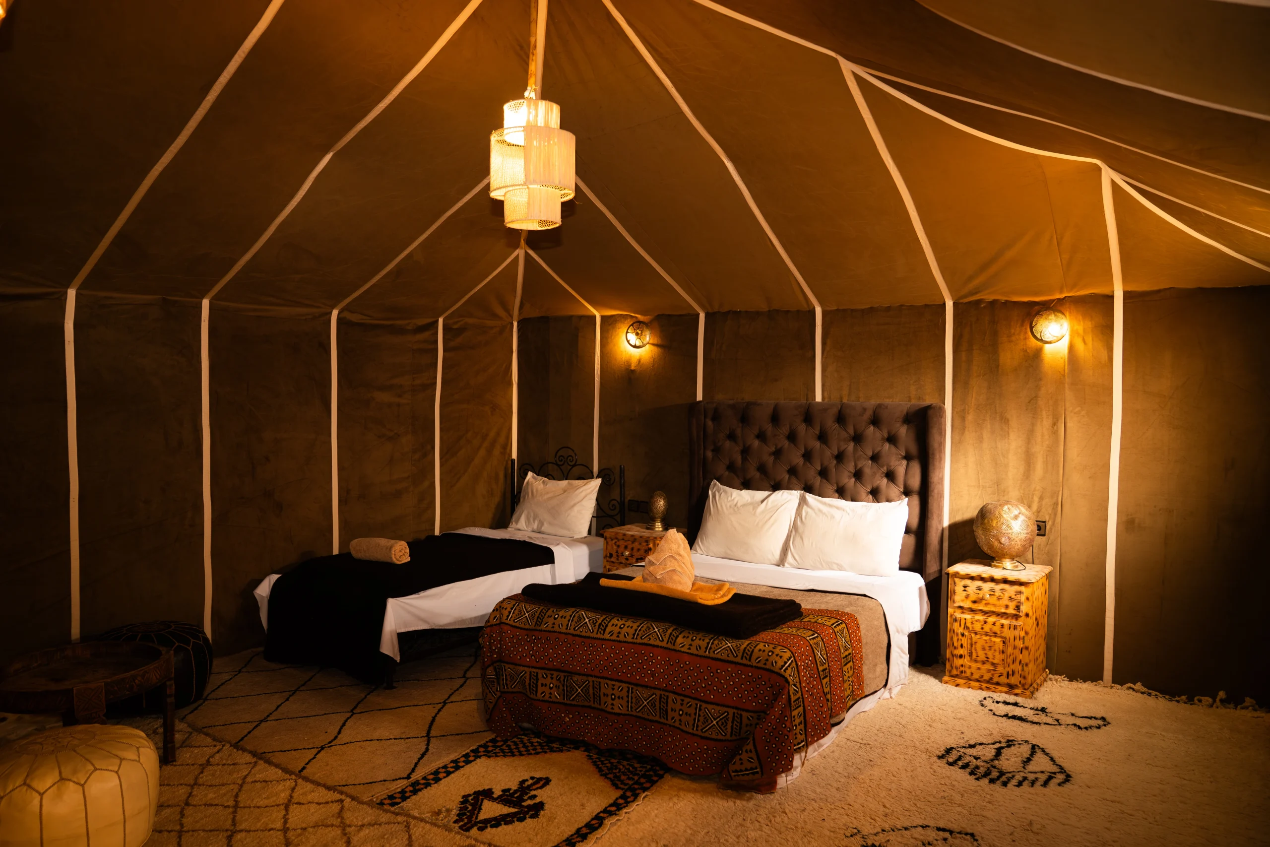 Defined by its iconic black and white striped canopy, The Black Suite is a bold tribute to the traditional “Khaima” tents of the Sahara. This spacious triple suite offers a sophisticated, high-contrast atmosphere, where deep ebony textures meet the soft ivory of the desert sands. It is a space designed for those who appreciate authentic Saharan aesthetics without compromising on modern luxury.